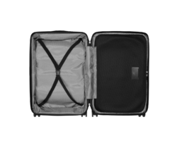 Internal functionality Compartimento espacioso para ropa con bandas elásticas en un lado y malla negra en el otro, cierre de cremallera y bolsillo para tarjetas de visita.