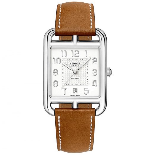 Con mecanismo de cuarzo en acero inoxidable y correa de piel de becerro en blanco con correa intercambiable en rojo.