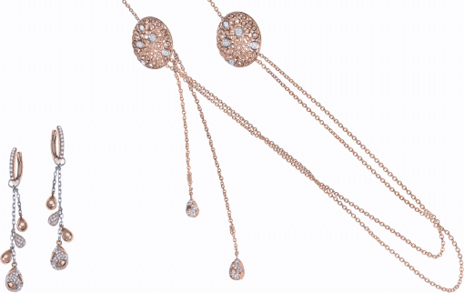 Aretes con rubelitas y diamantes en oro rosa de 18 kt. Collar largo en oro rosa y blanco de 18 kt con diamantes.